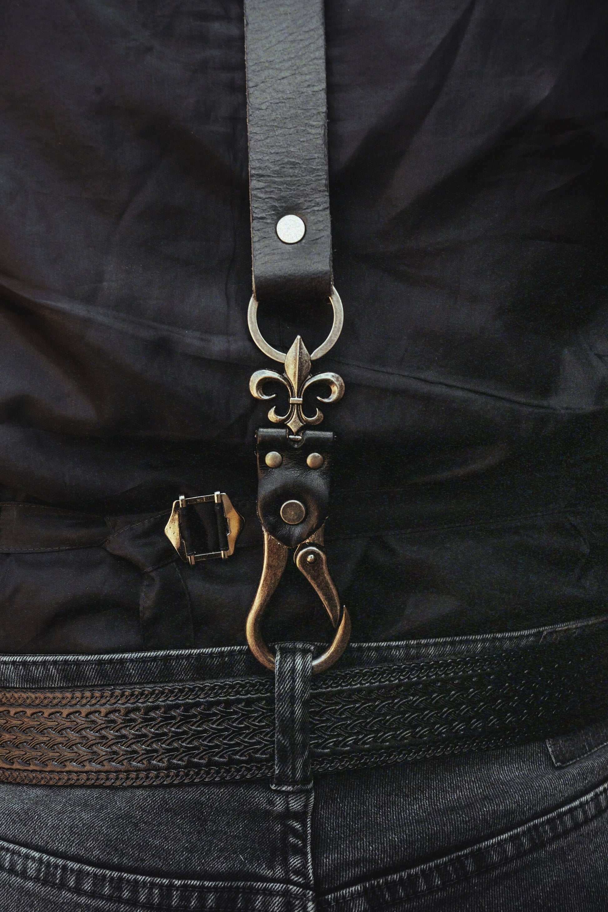 Handcrafted leather braces made from premium buffalo leather, featuring a Fluer de Lis decoration, are a stylish and durable accessory for both casual and formal occasions. These braces are fixed with Chicago screws and heavy-duty lobster clasps, ensuring durability and comfort. The adjustable front straps allow for a perfect fit, and they are perfect for those who appreciate quality craftsmanship.